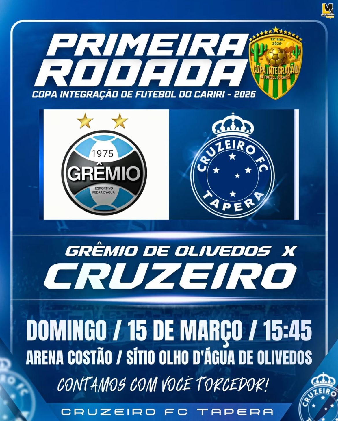 Com apoio da Prefeitura de Cabaceiras, equipe do Cruzeiro da Tapera estreia neste domingo na Copa Integração de Futebol do Cariri 13/03/2026
