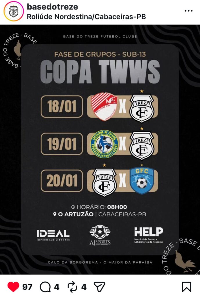 A “Base do Treze” (equipe de futebol do Treze Futebol Clube) divulgou seu cronograma de atividades do final de semana e a equipe Sub-13 vai desembarcar na cidade de Cabaceiras para a participar da Copa TWWS de futebol de base .